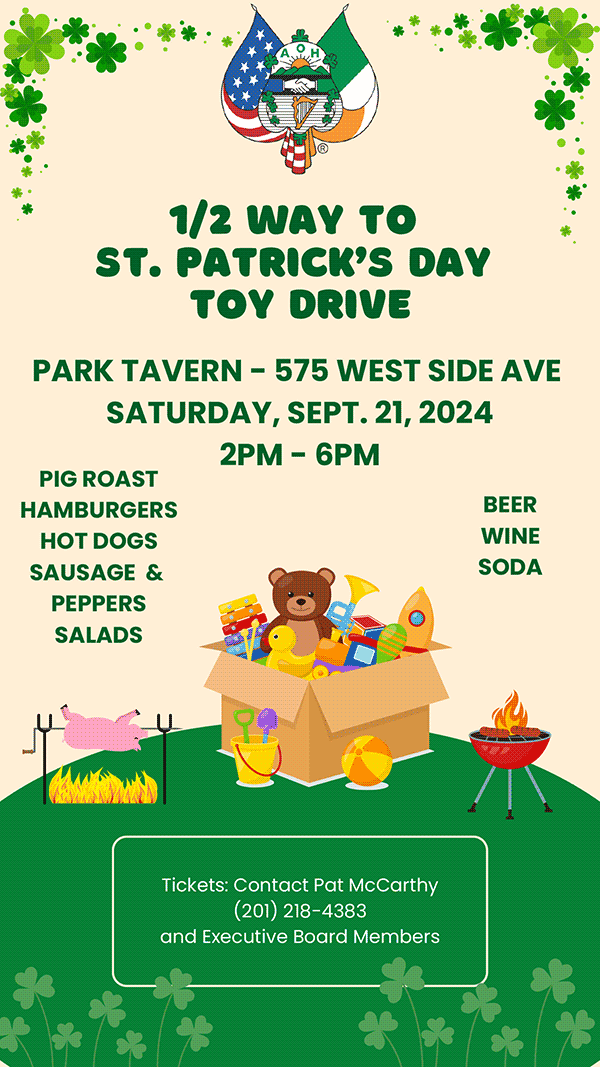 The New Park Tavern 575 West Side Ave, Jersey City, NJ, United StatesTHE FLYER SAYS 21st, CHANGED TO October 5th1/2 WAY TO ST. PATRICK’S DAY TOY DRIVEPARK TAVERN - 575 WEST SIDE AVE SATURDAY, SEPT. 28, 20242PM - 6PMPlease bring an unwrapped toy for the children.$40.00PIG ROASTHAMBURGERSHOT DOGSSAUSAGE & PEPPERSSALADSBEERWINESODA